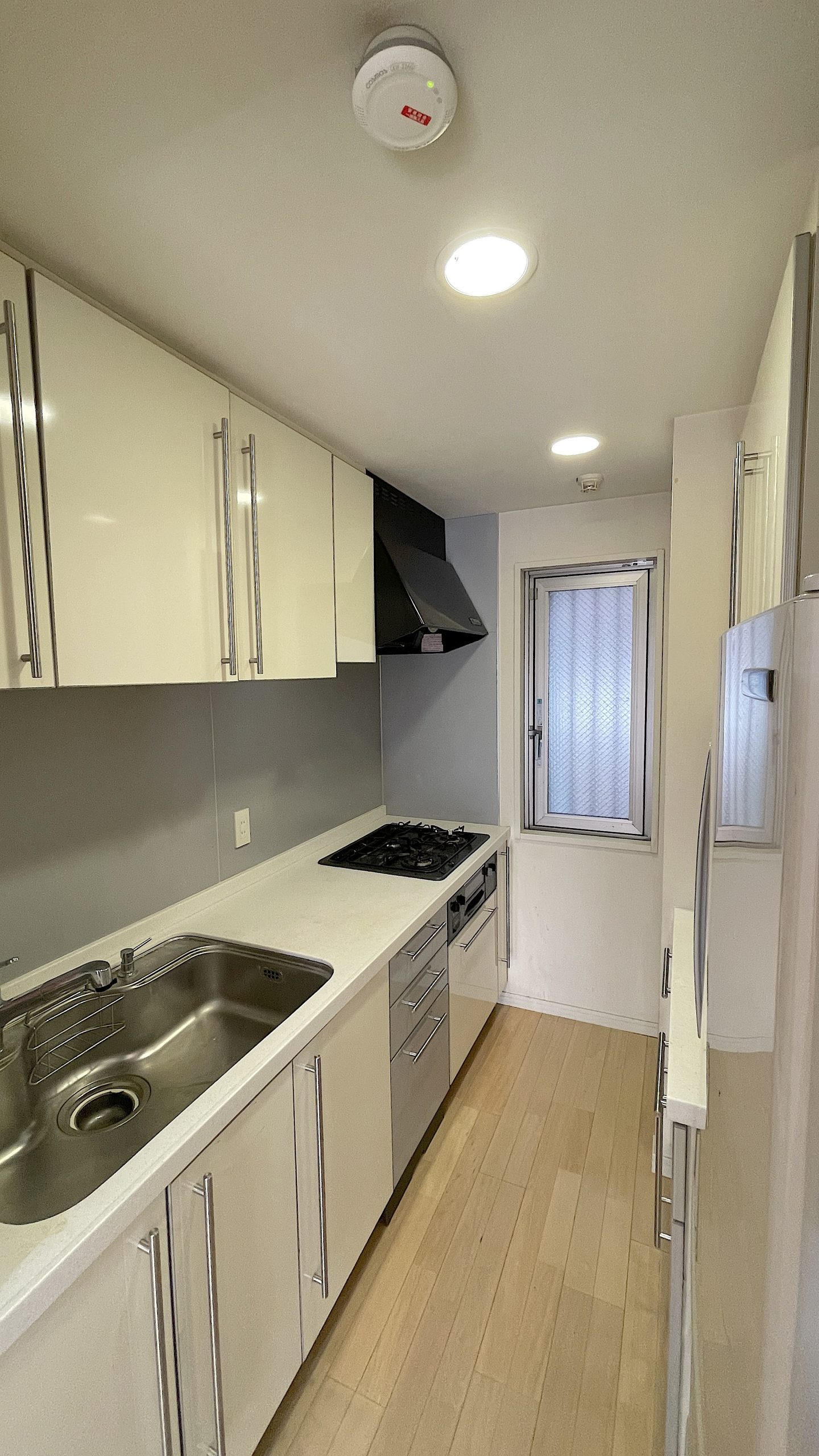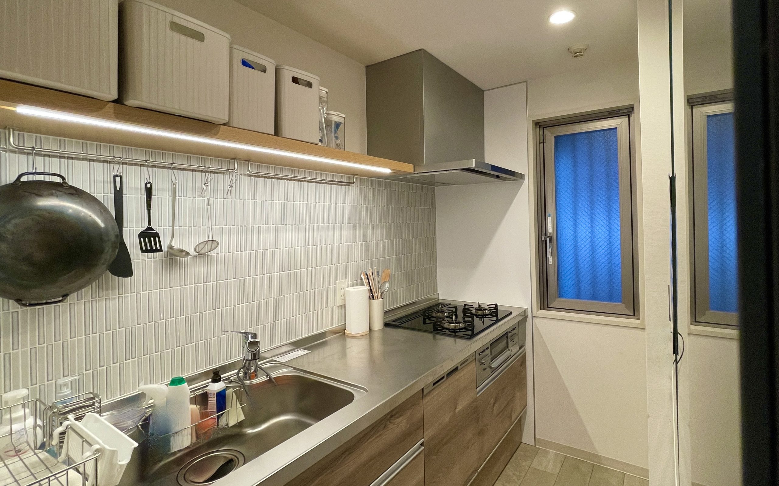 既製キッチン(クリナップ)に入れ換えレンジフードは自動洗浄システムに変更