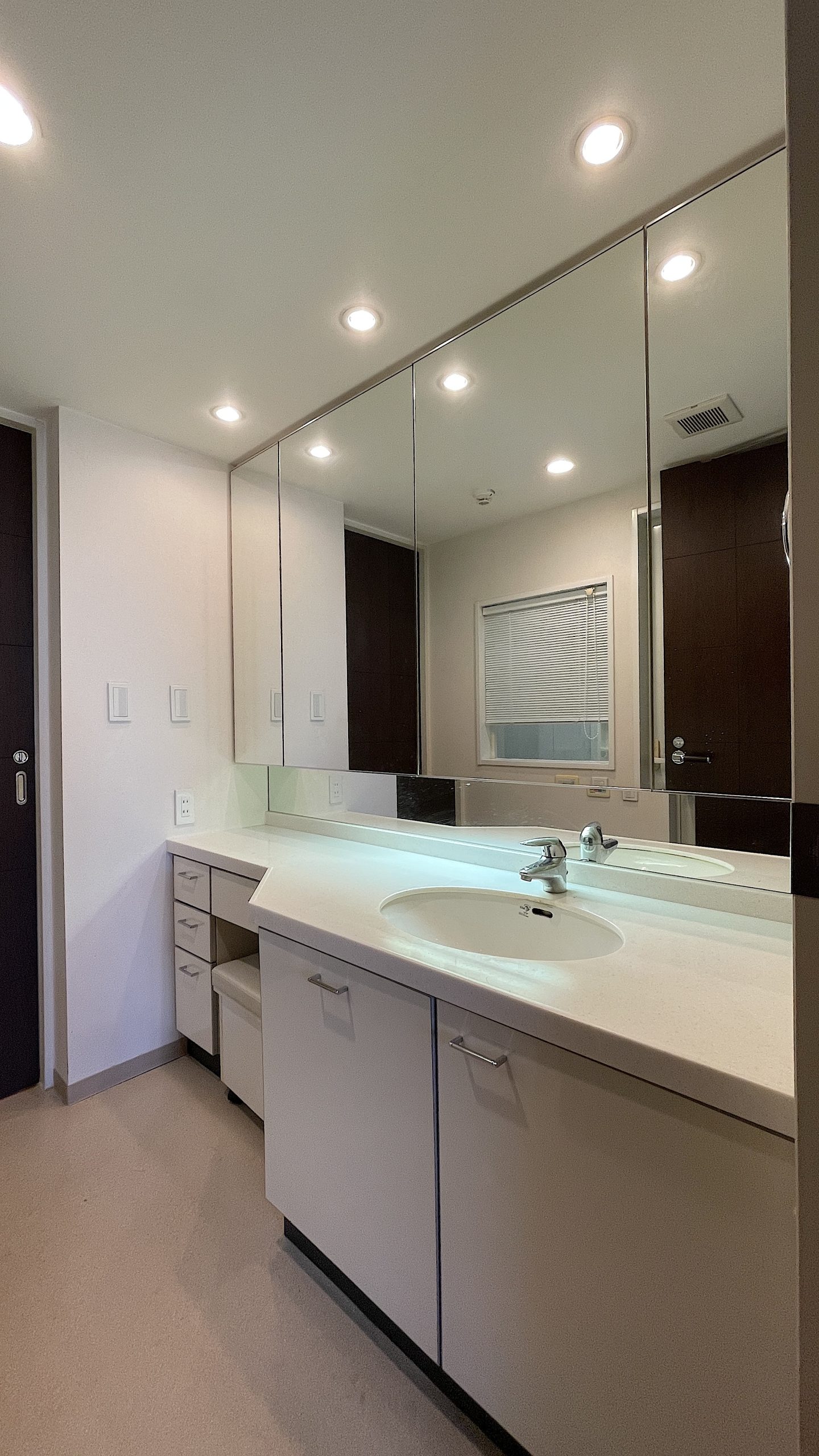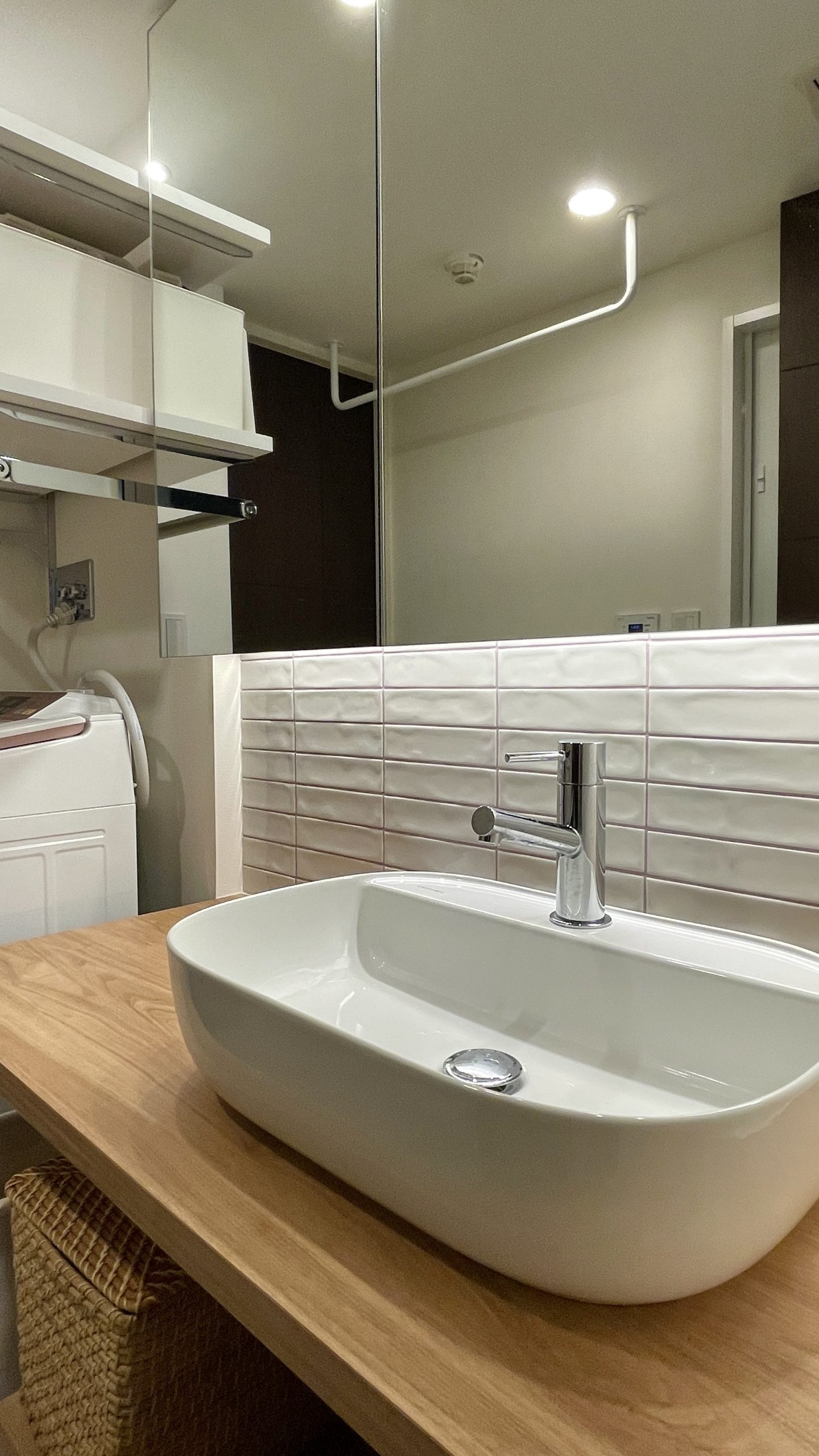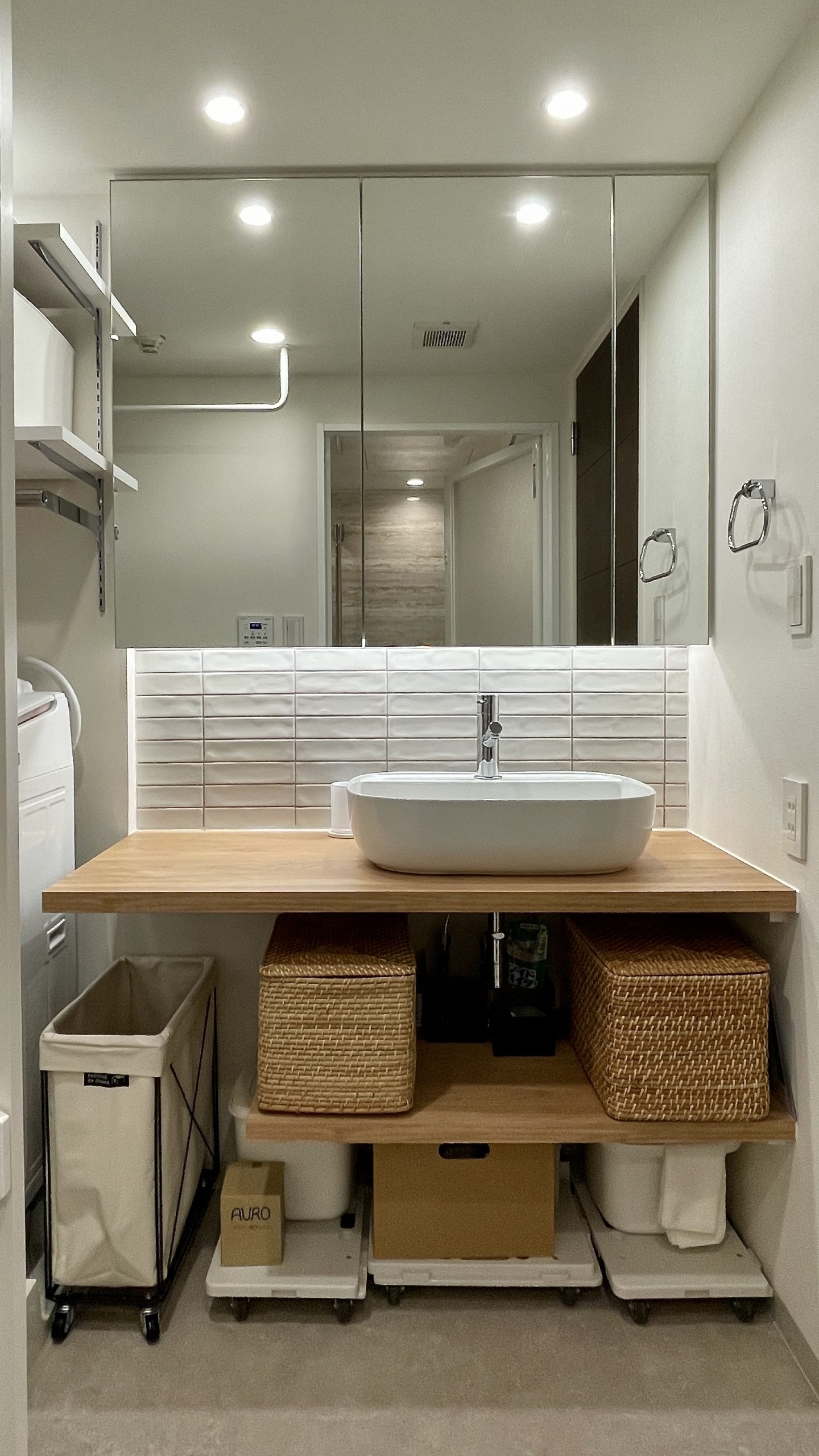 新規収納ミラー設置 特注の洗面台はシンプルに棚のみとした