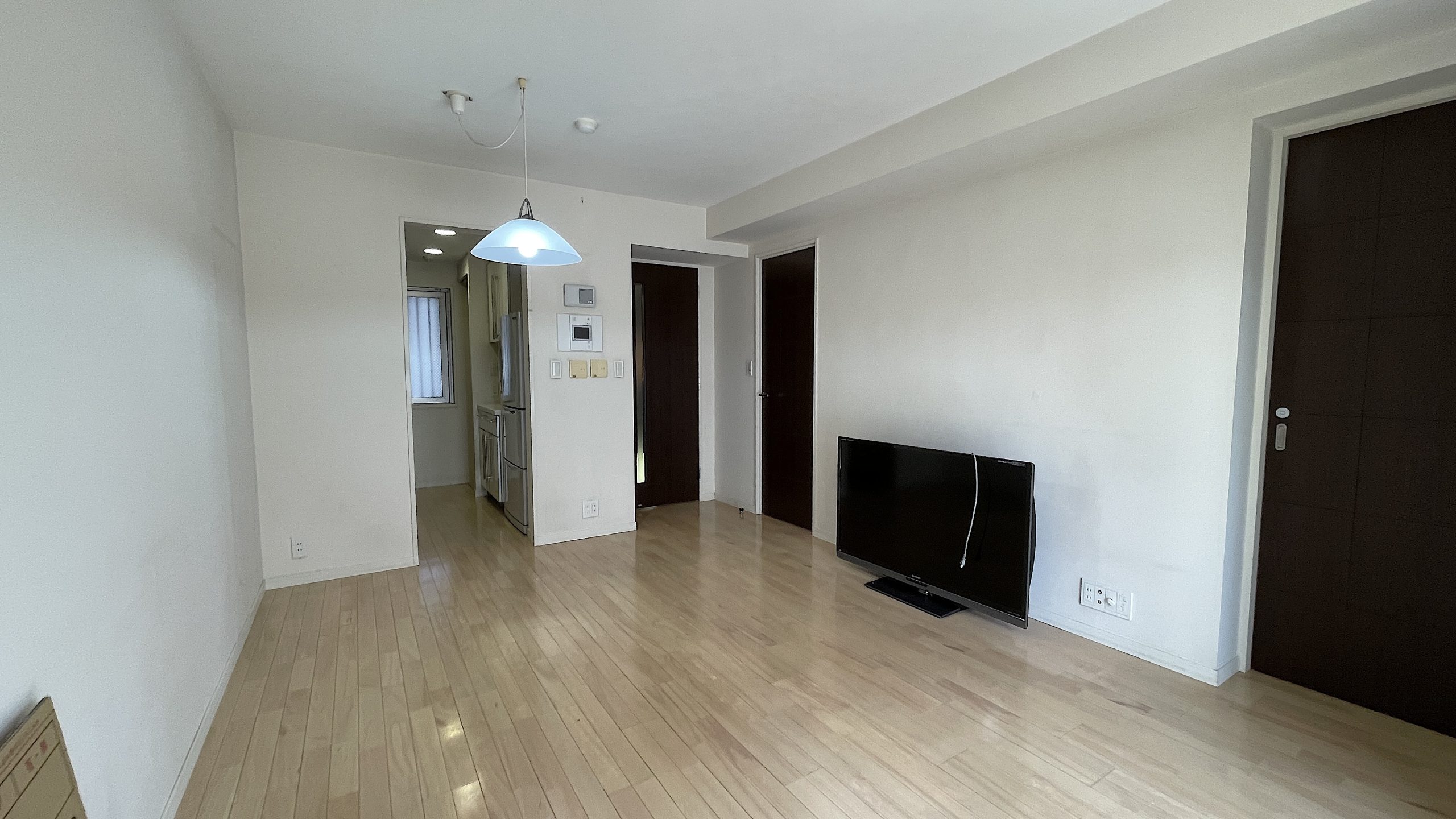 テレビ台は既存の物を活かし壁は新規木風クロス貼りとし